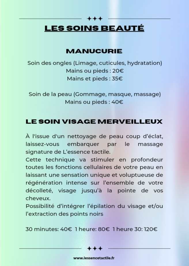 Le visage Merveilleux: Il comprend un drainage lymphatique, un lifting manuel, une stimulation énergétique clôturé par une vague de douceur sur l’ensemble du décolleté, les trapèzes, le visage et le cuir chevelu pour une durée qui oscille entre 30 minutes à une heure selon les besoins du client. Il est très long et fastidieux et demande une grande concentration.